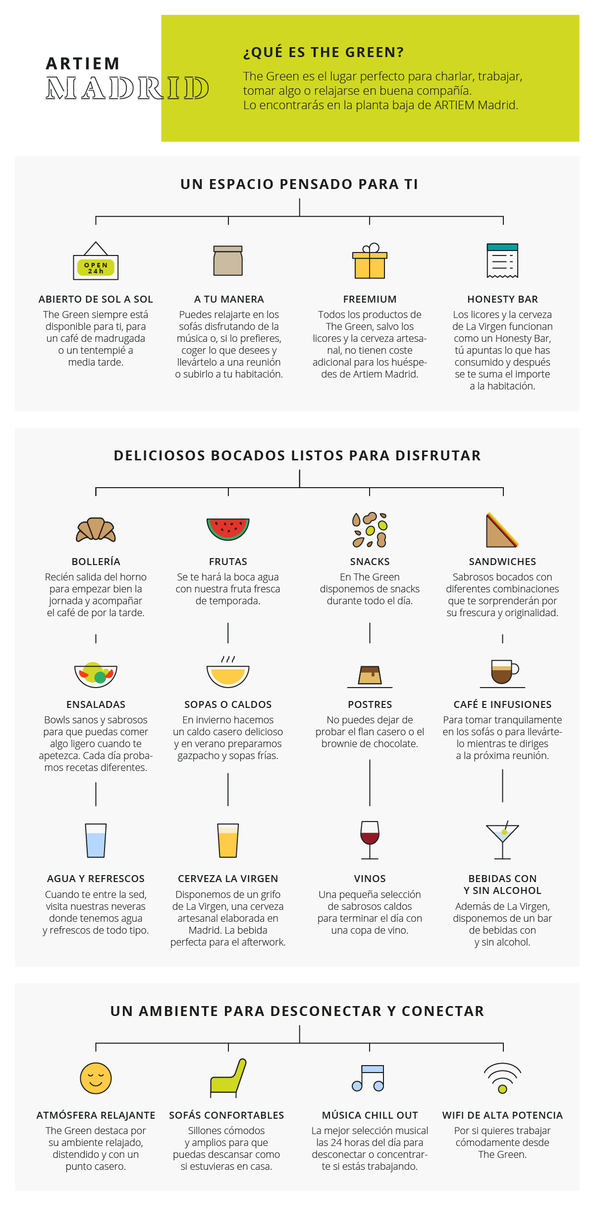 The Green va contigo, literalmente. Nuestro lounge & snack, situado en la planta baja del hotel ARTIEM Madrid, se transforma a lo largo del día para ofrecerte todo lo que necesitas en cada momento: un té rápido por las mañanas, un aperitivo sano y ligero a la hora de comer, una bebida a última hora mientras haces networking o un café cuando estás trabajando a altas horas de la noche. Todo lo que necesitas las 24 horas del día y gratis para nuestros huéspedes.