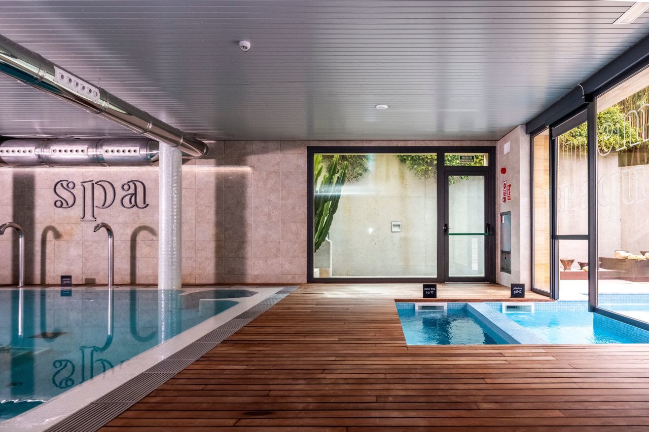 Dynamic pool with underwater jets and chromotherapy, swan neck fountains, water beds, water cannons, geyser, bubble bench, footbath, dry sauna, steam bath with starry ceiling, and contrast, mist, and aromatic showers
