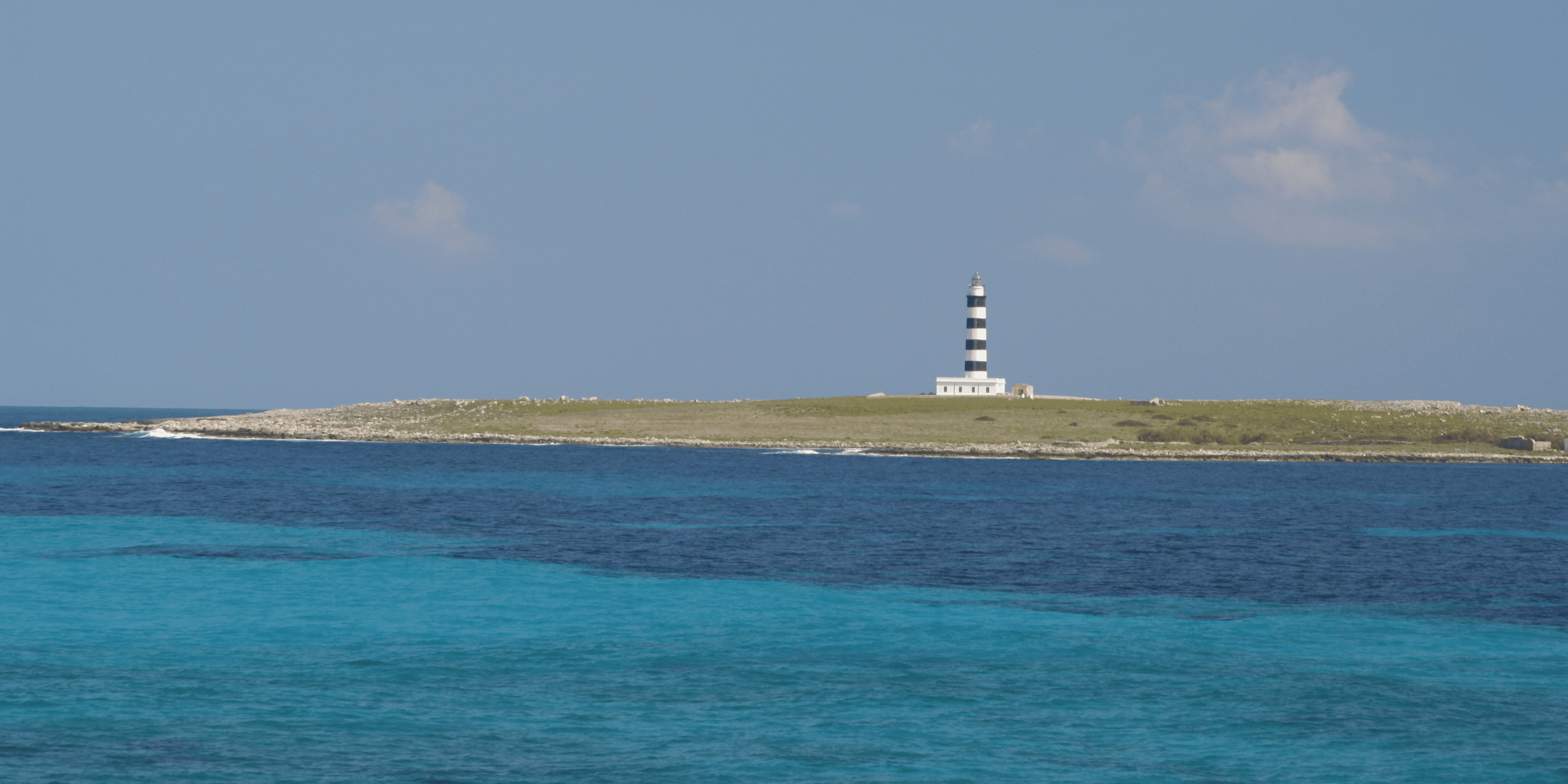 It is one of the bluest areas of the sea of Menorca, with the small Isla del Aire and its lighthouse as the main view.